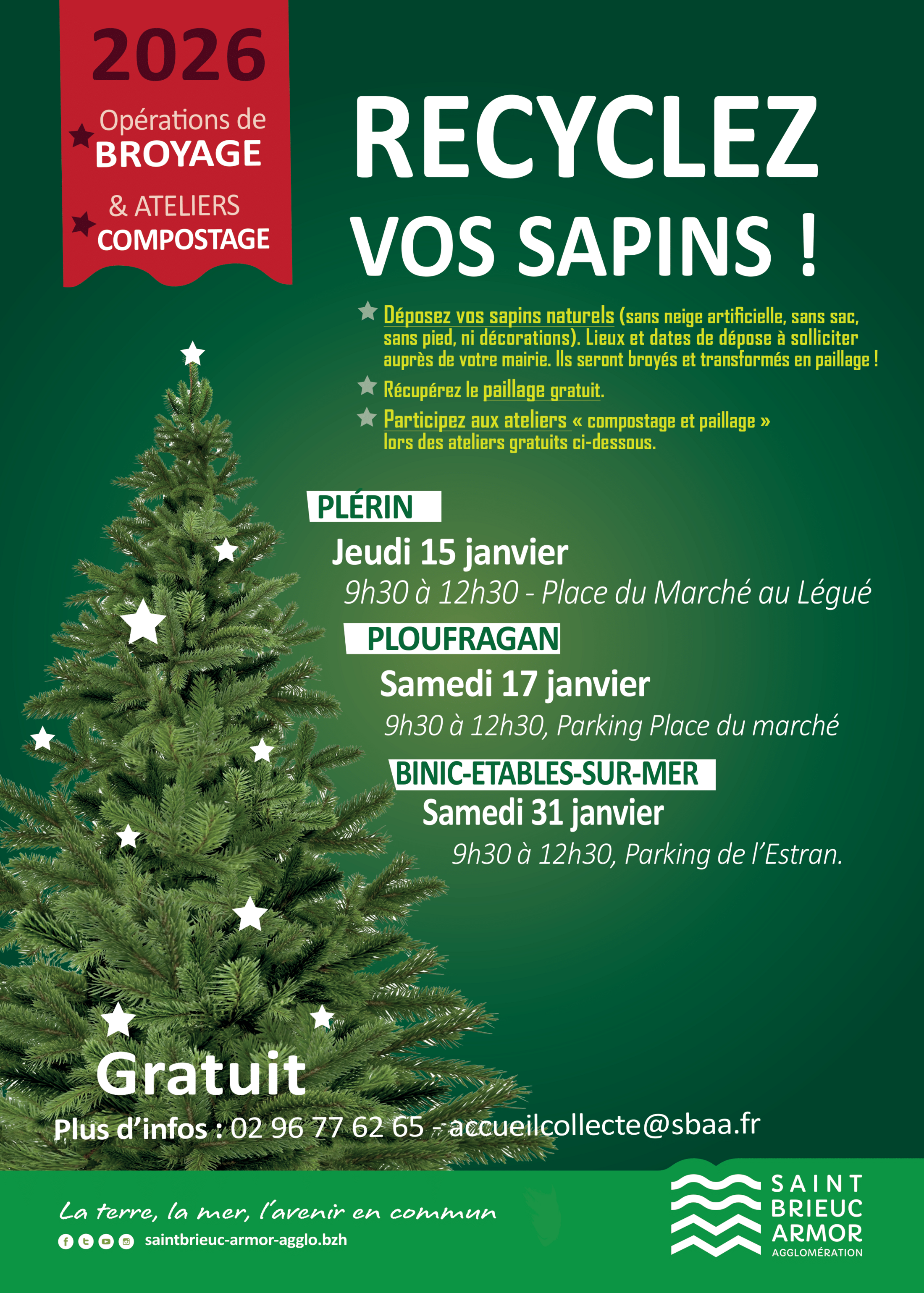 lieux et dates spécifiées par votre mairie. Une fois collectés, les sapins seront broyés et